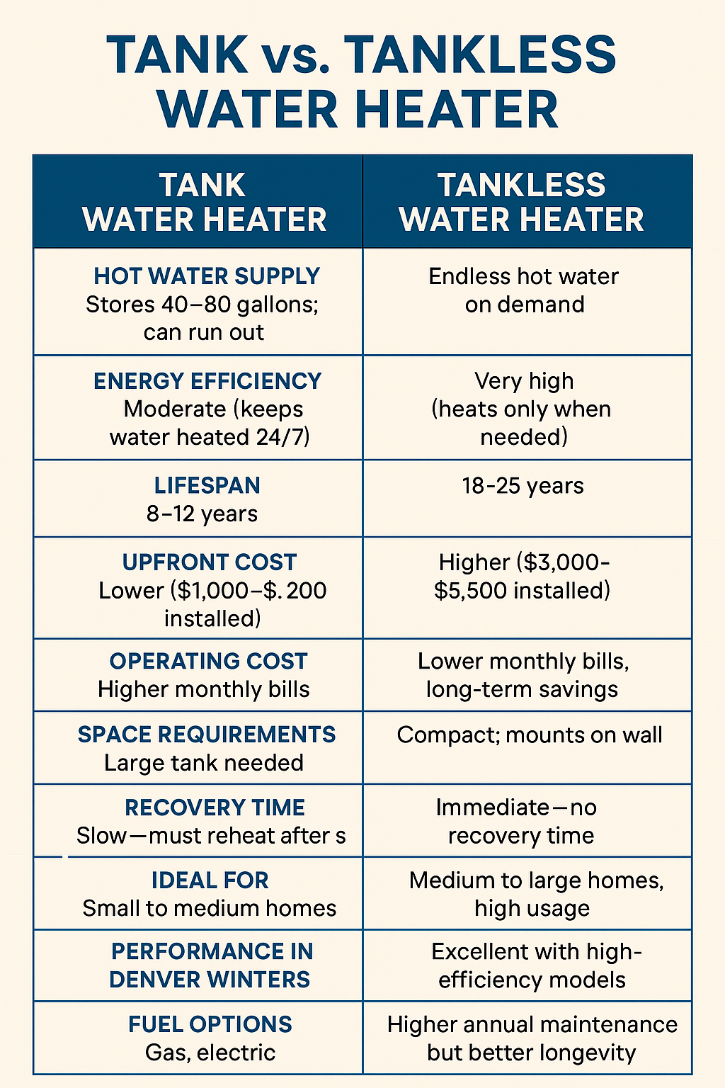 Feature Tank Water Heater Tankless Water Heater Hot Water Supply Stores 40–80 gallons; can run out Endless hot water on demand Energy Efficiency Moderate (keeps water heated 24/7) Very high (heats only when needed) Lifespan 8–12 years 18–25 years Upfront Cost Lower ($1,000–$2,200 installed) Higher ($3,000–$5,500 installed) Operating Cost Higher monthly bills Lower monthly bills, long-term savings Space Requirements Large tank needed Compact; mounts on wall Recovery Time Slow—must reheat after use Immediate—no recovery time Ideal For Small to medium homes Medium to large homes, high usage Performance in Denver Winters Consistent but less efficient Excellent with high-efficiency models Fuel Options Gas, electric Gas (most common), electric Maintenance Lower annual maintenance Higher annual maintenance but better longevity Environmental Impact Moderate Lower carbon footprint